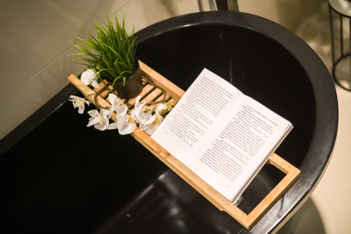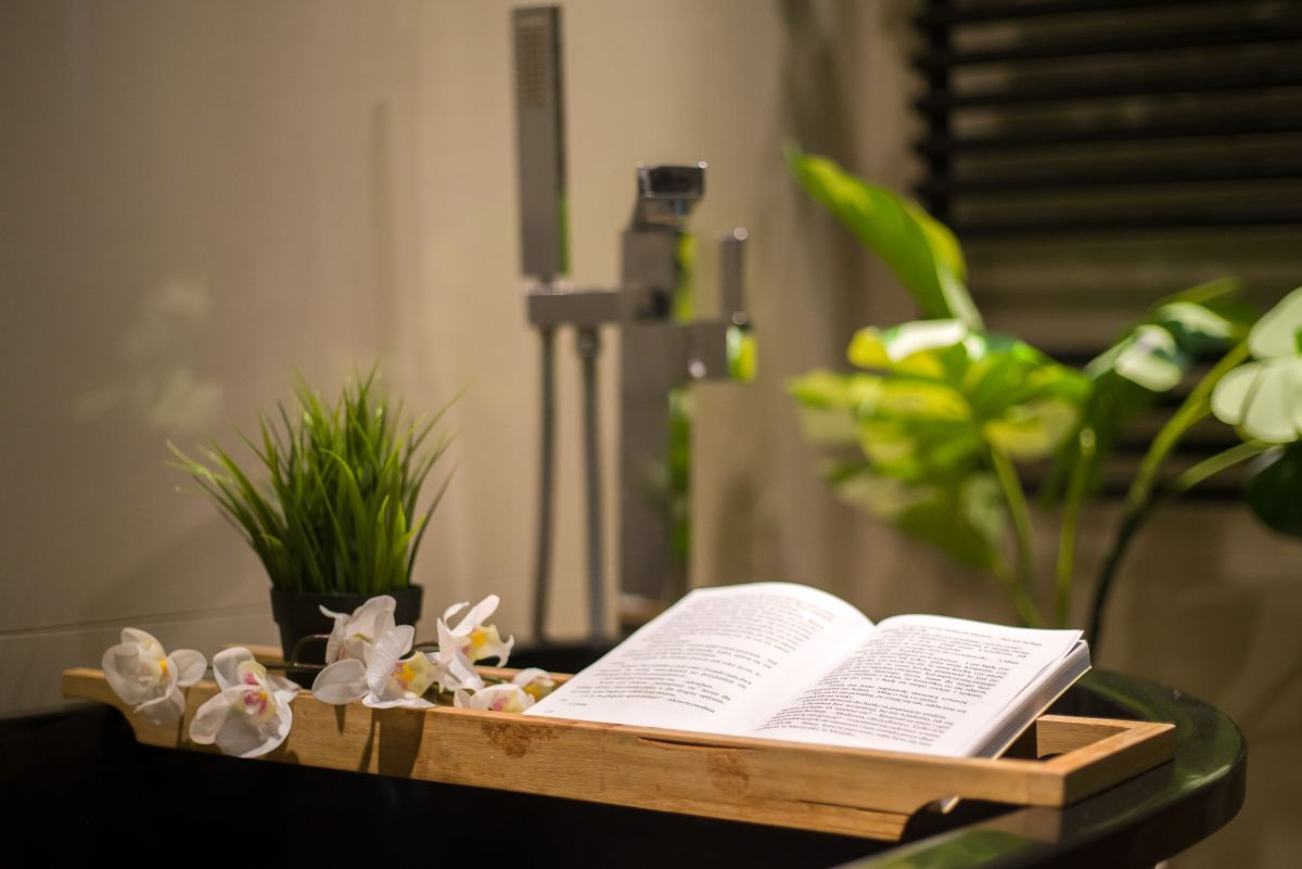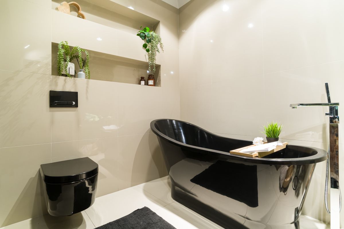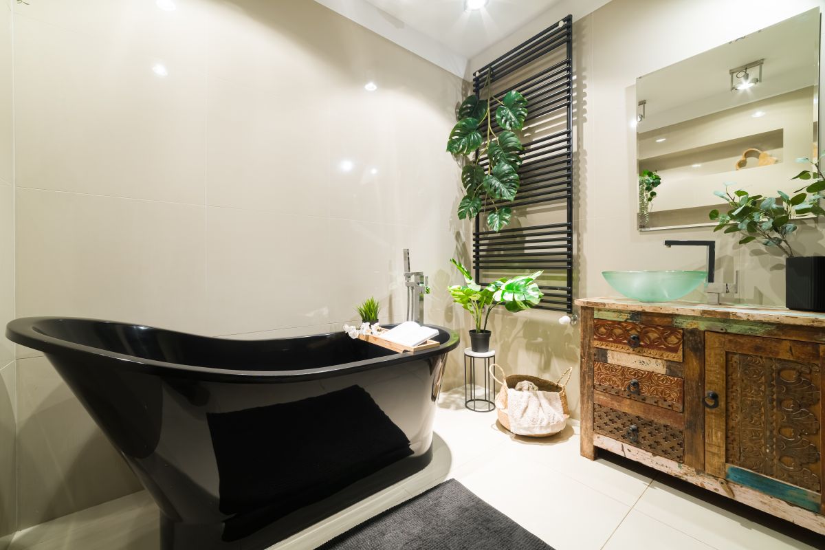 - wysokiej klasy łazienka z szafką z drzewa Mango