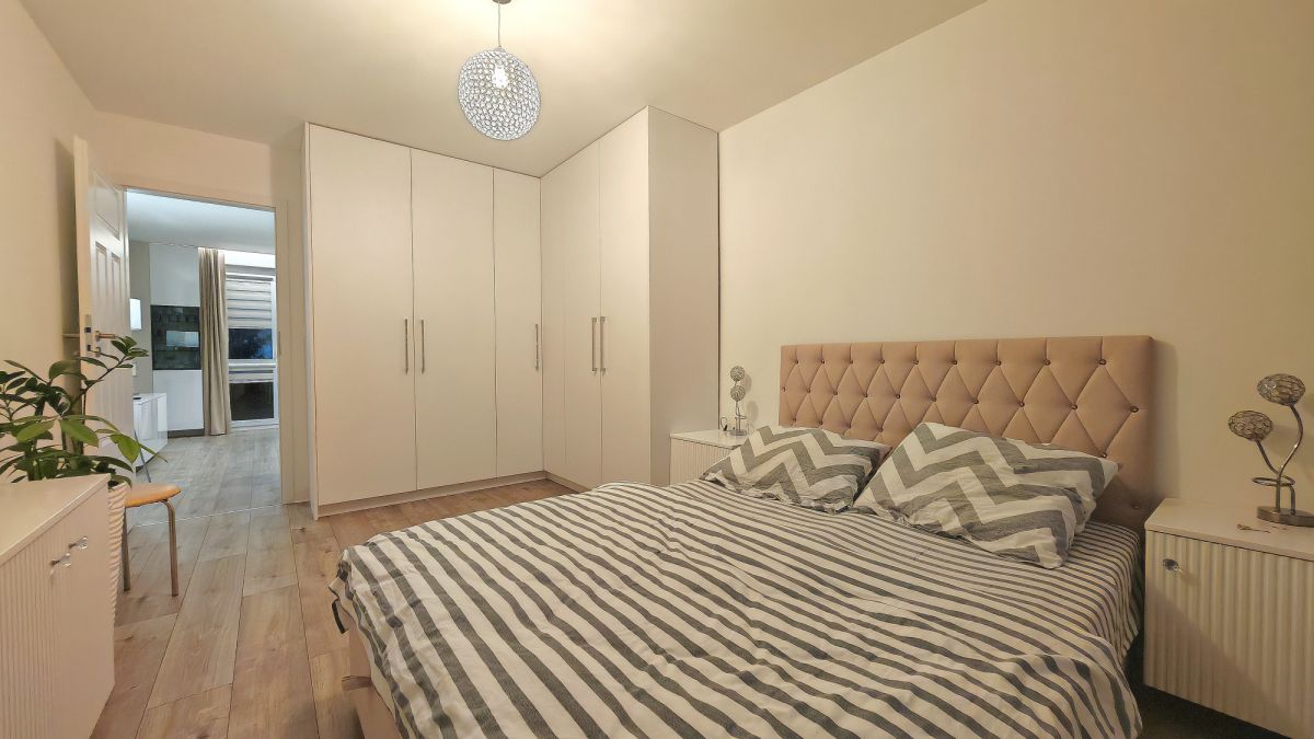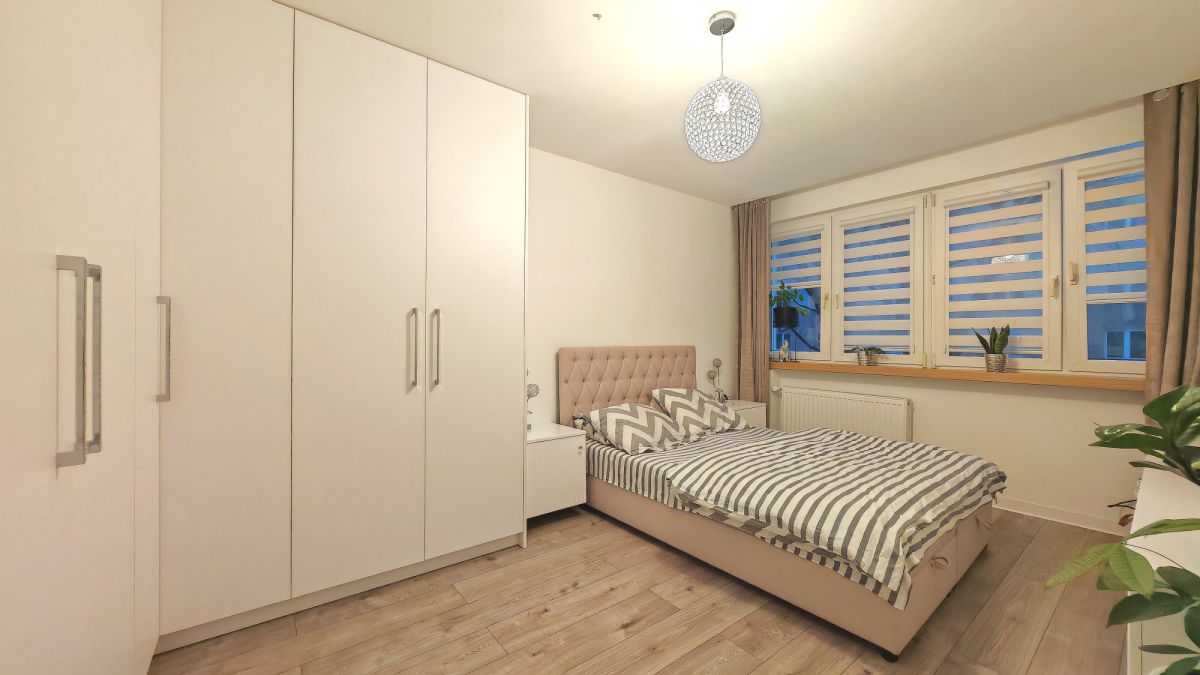 - ustawna sypialnia z dużą szafą w zabudowie,