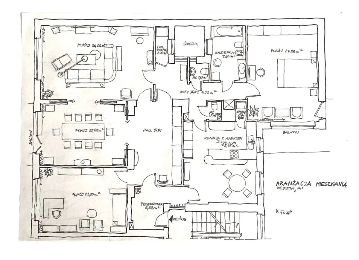 -mieszkanie posiada wiele możliwości aranżacyjnych - pokazano dwie z nich.