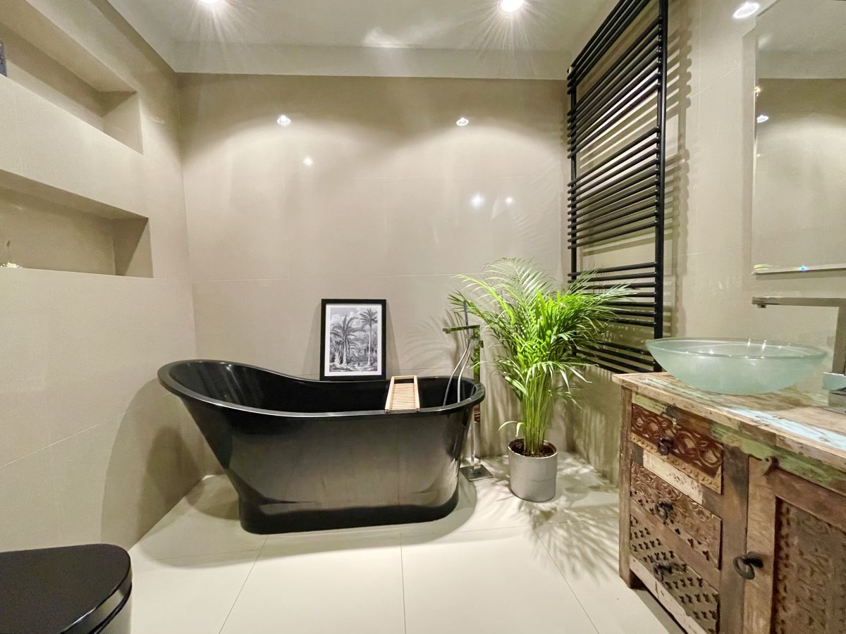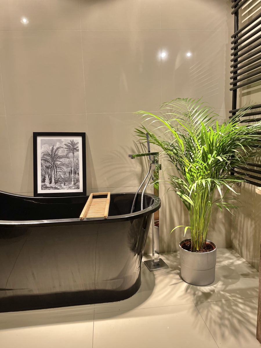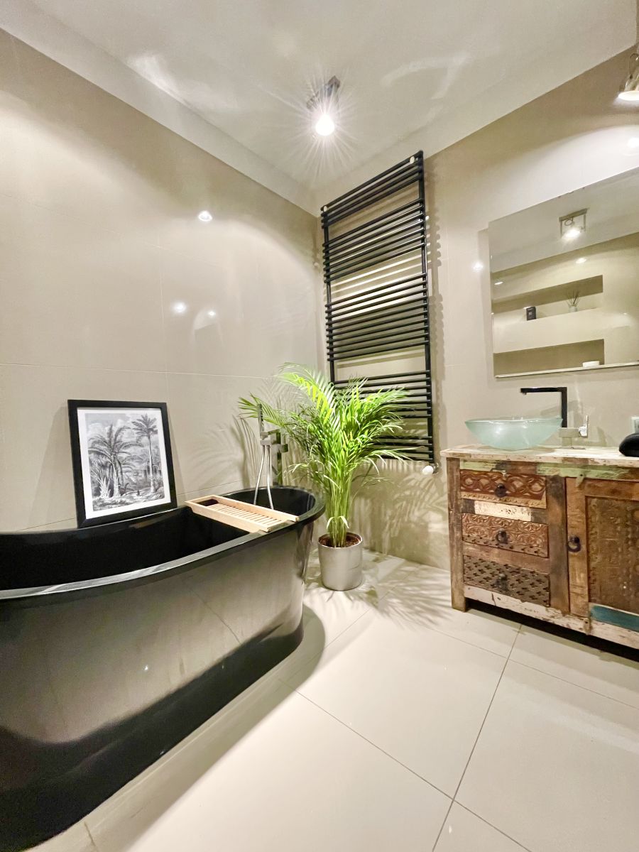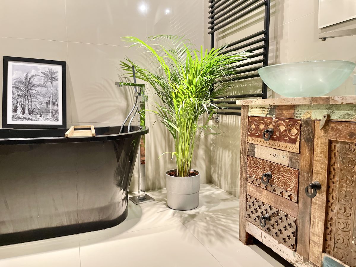 - wysokiej klasy łazienka z szafką z drzewa Mango