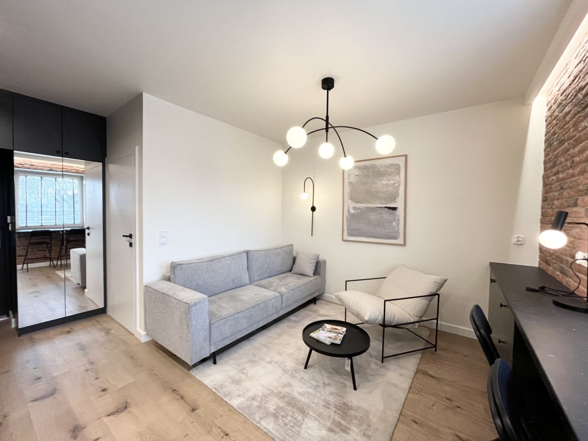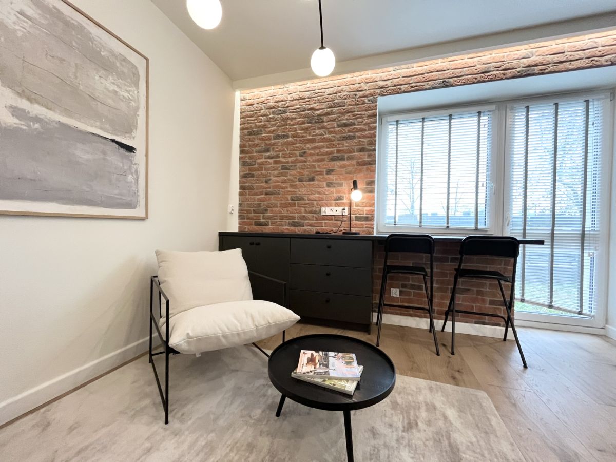 W pełni zabudowane meble stolarskie wykonane na wymiar, najwyższej jakości materiały - drewno, panele winylowe oraz cegła na ścianach - nadają wnętrzu unikalny charakter.