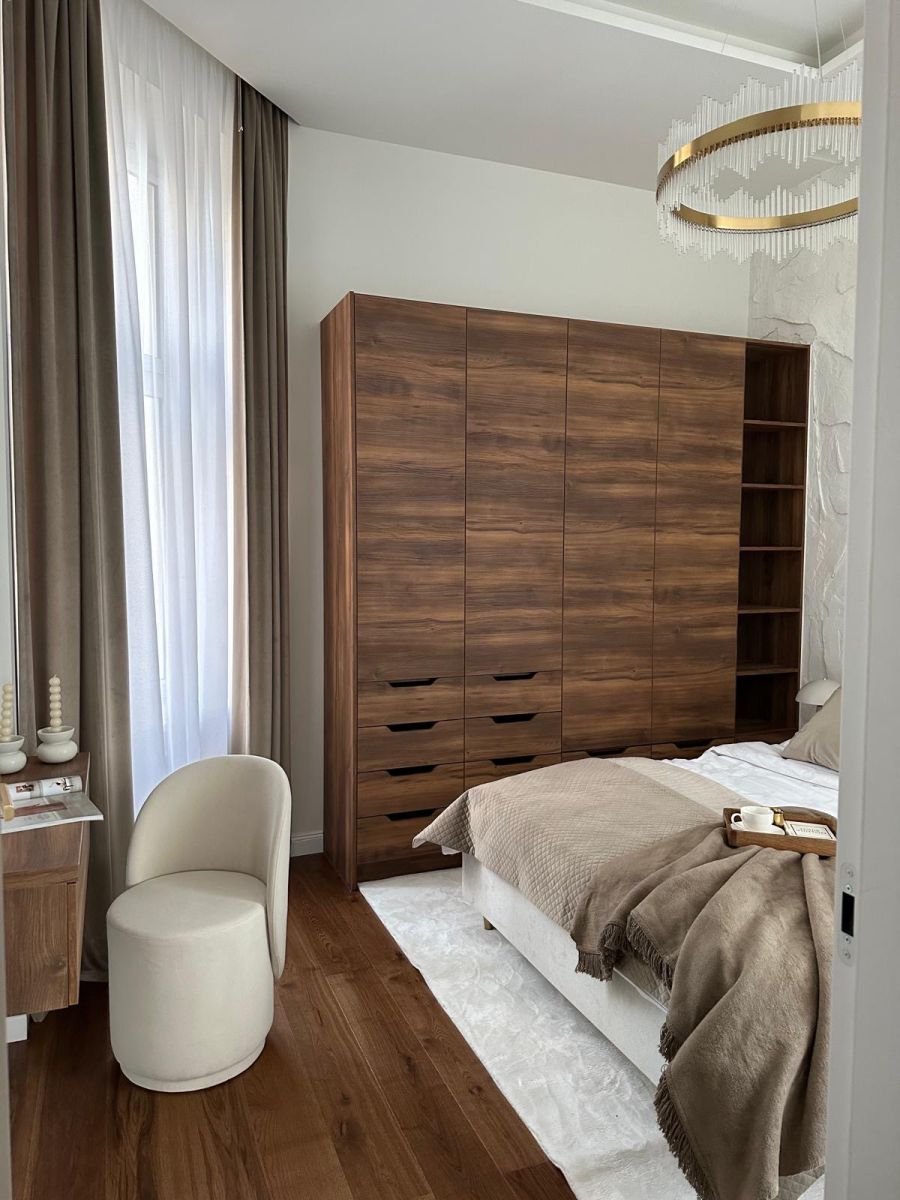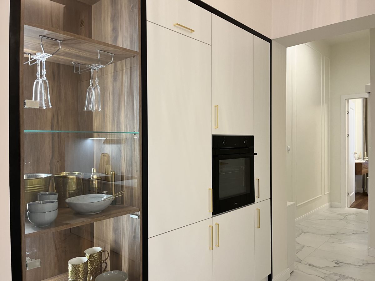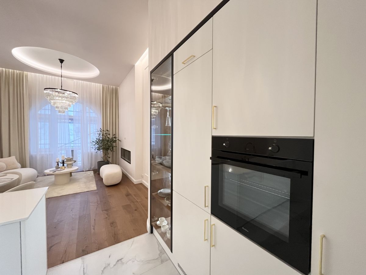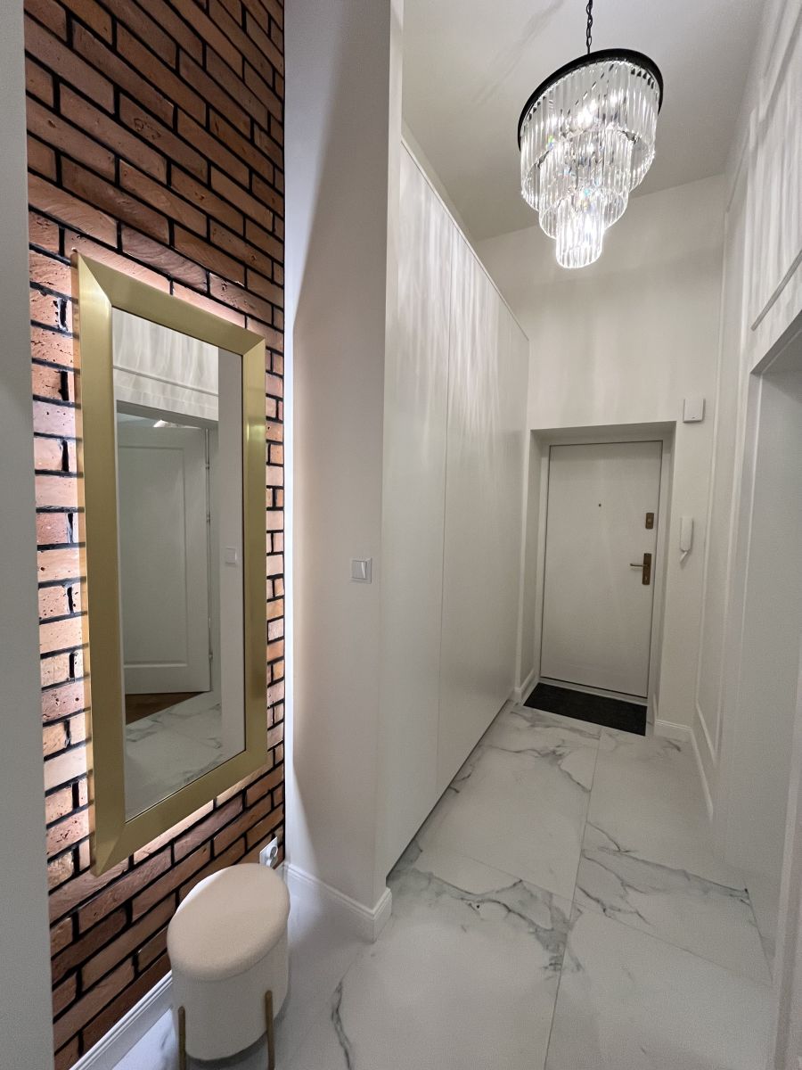 W pełni zabudowane meble stolarskie wykonane na wymiar, najwyższej jakości materiały. Sufity zdobią piękne żyrandole.