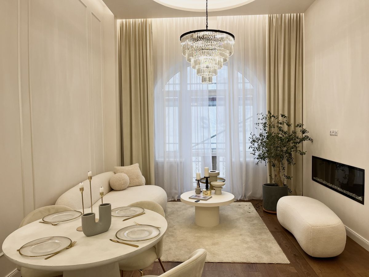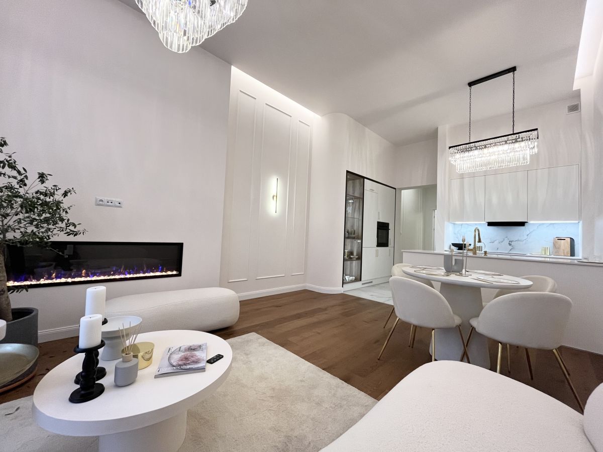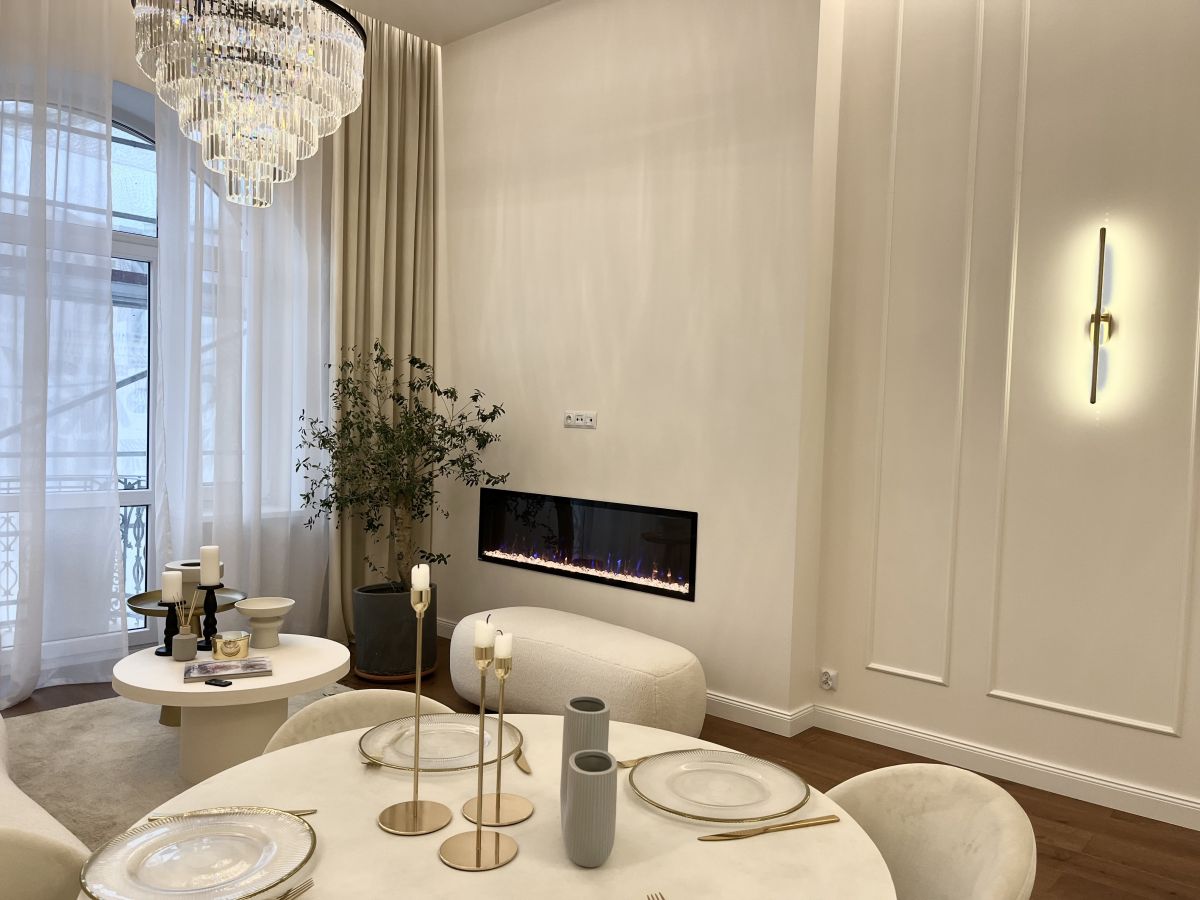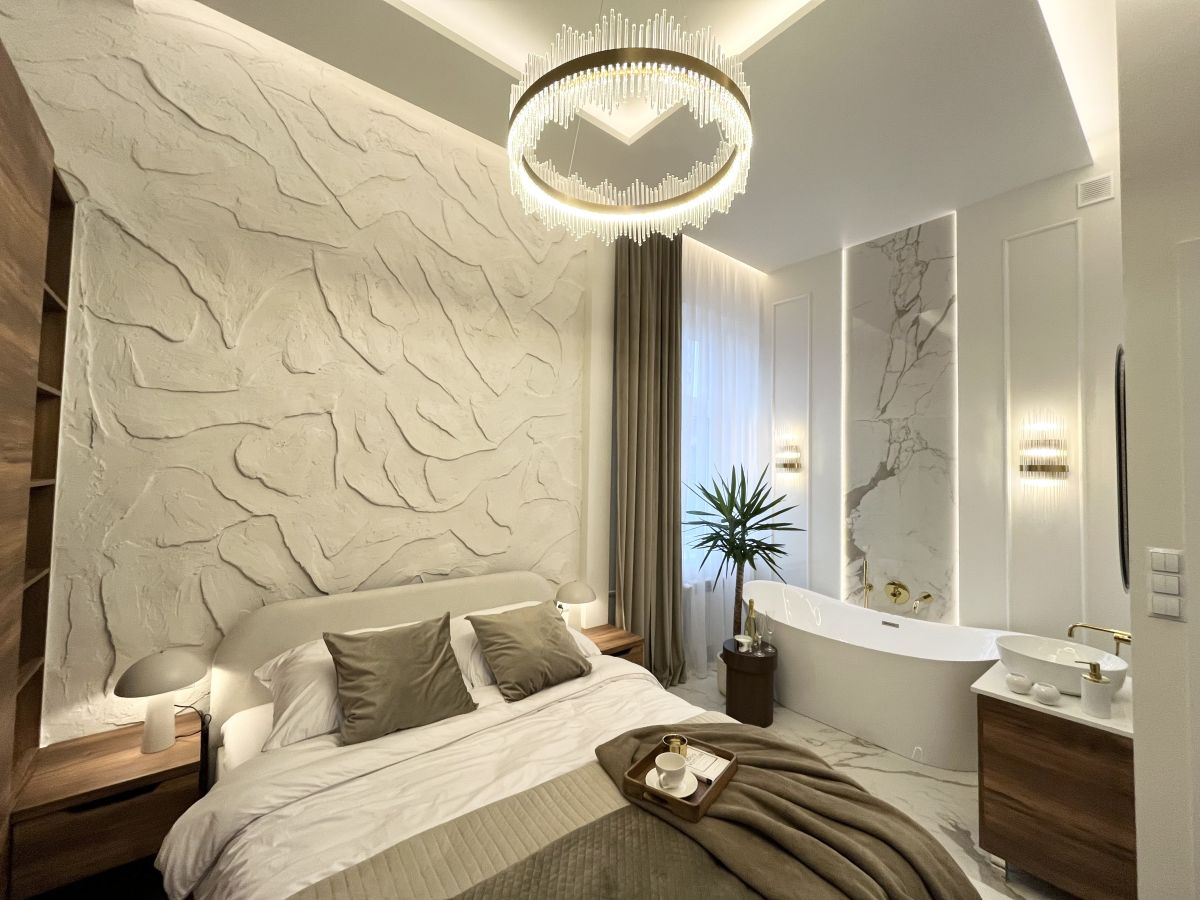 W pełni zabudowane meble stolarskie wykonane na wymiar, najwyższej jakości materiały. Sufity zdobią piękne żyrandole.