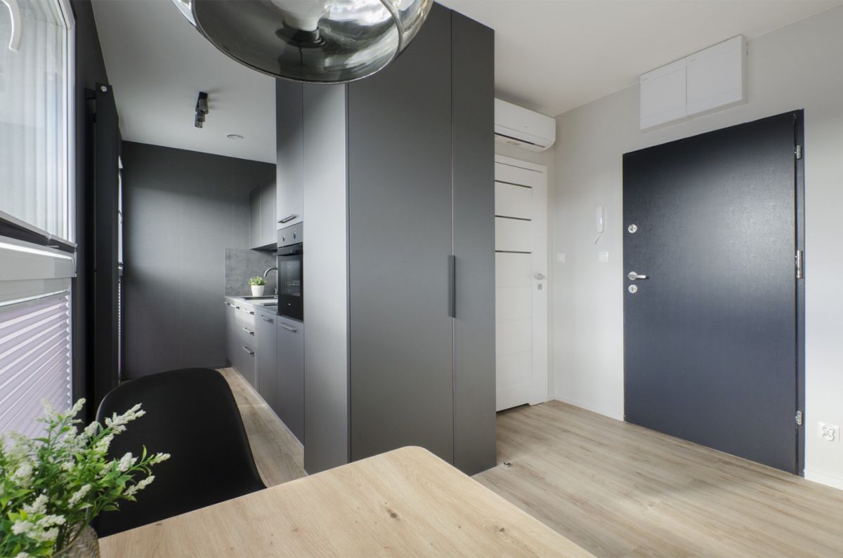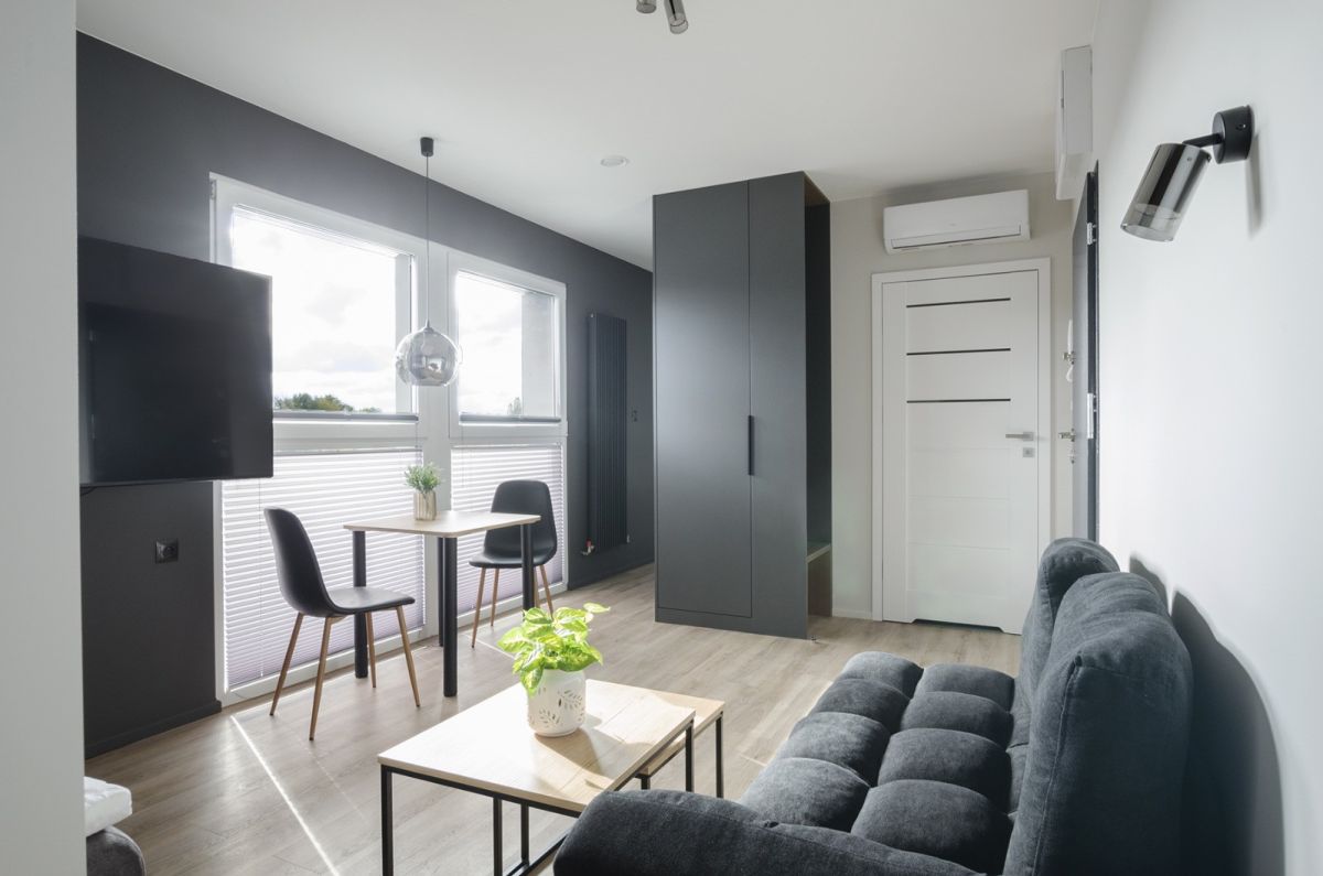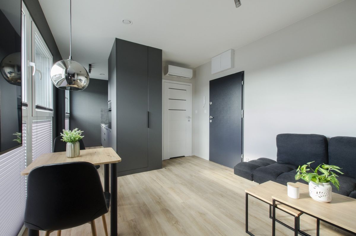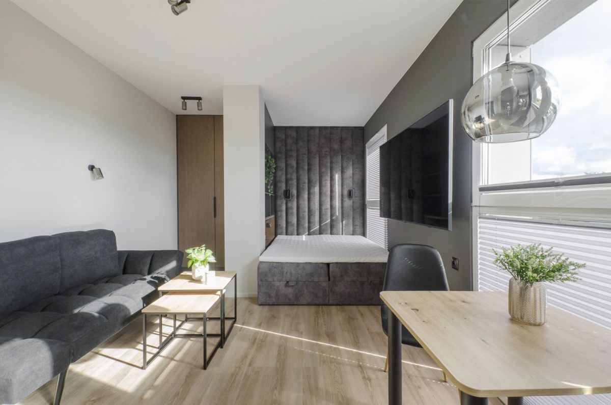 Na sprzedaż komfortowe, całkowicie nowe studio zaprojektowane przez architekta wnętrz. Jasne, ciepłe kolory i naturalne drewno tworzą przytulną, elegancką przestrzeń.