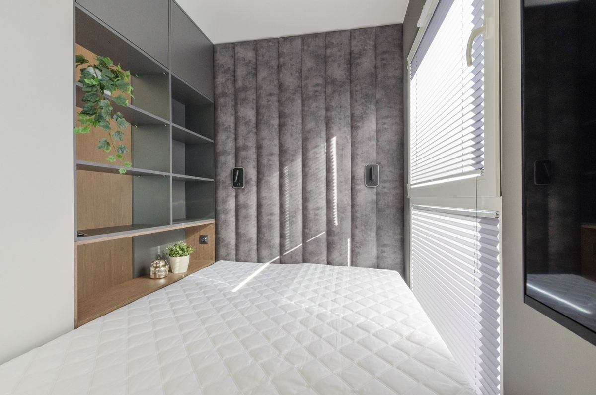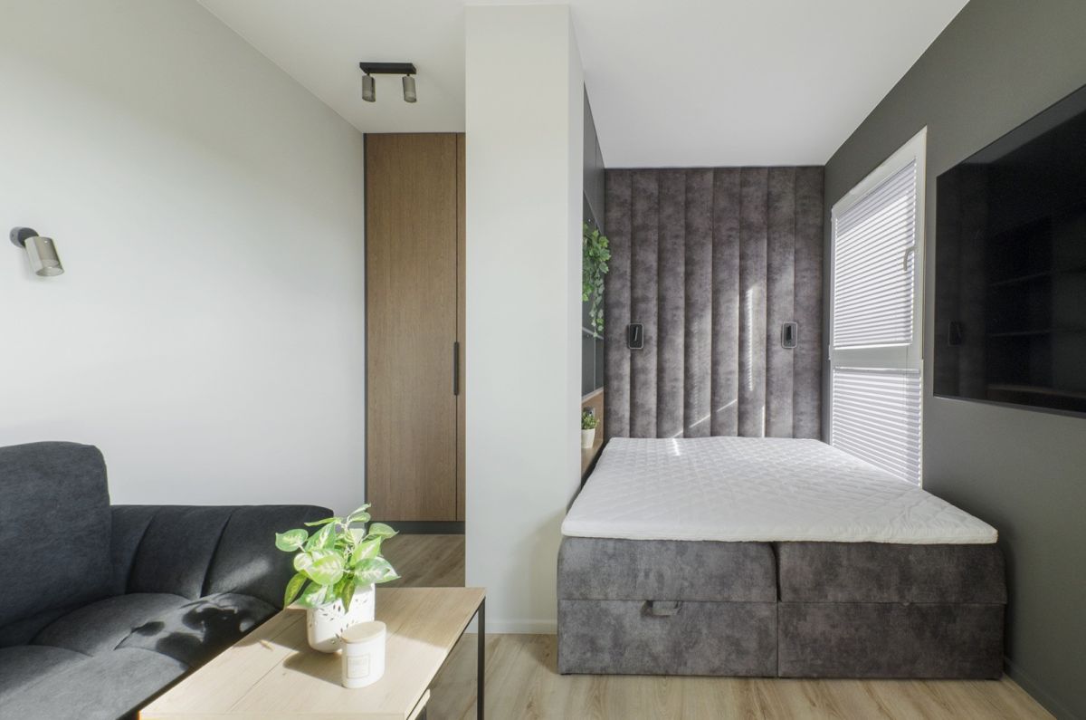 - część dzienna z sofą i TV płynnie łączy się ze strefą sypialnianą z pełnowymiarowym łóżkiem i schowkiem,