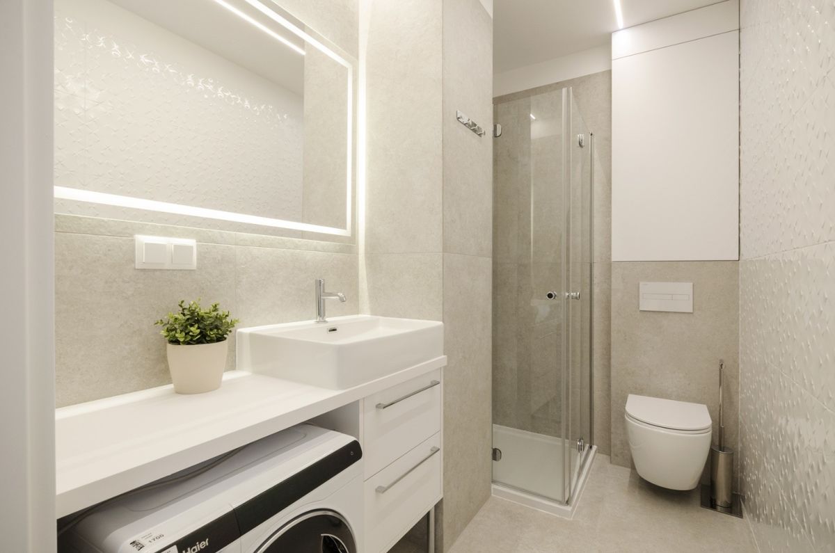 - elegancka łazienka z prysznicem, pralką i zabudową.