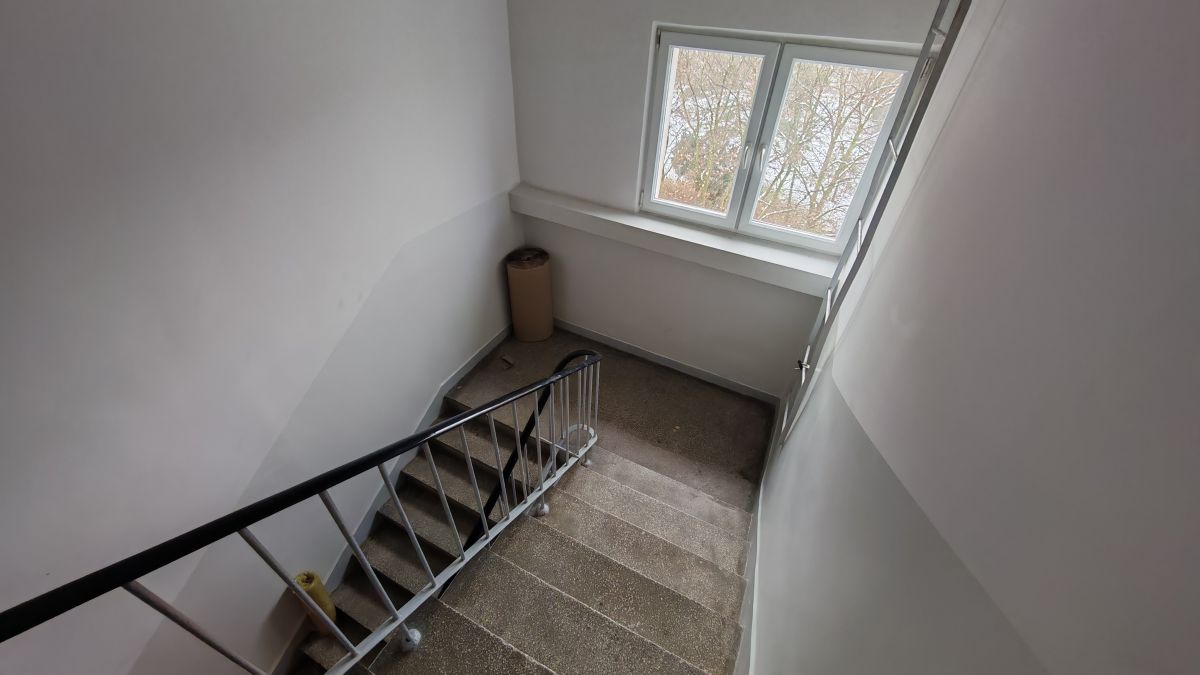 Klatka schodowa jest czysta i zadbana, a sam budynek położony jest wśród zieleni.